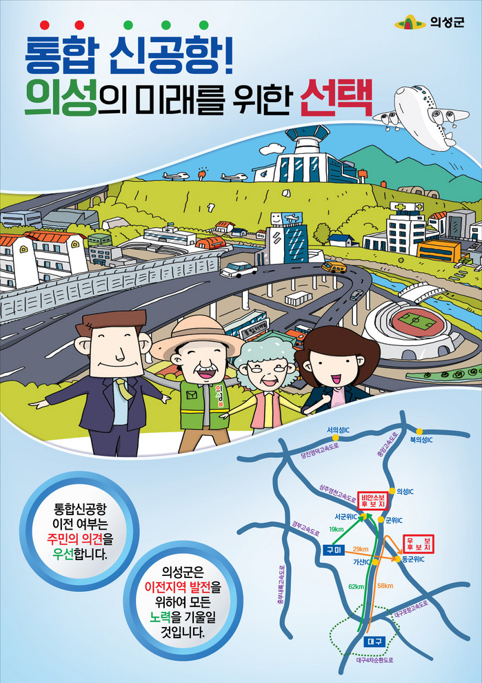 의성군은 홈페이지, 의성메아리, 전광판, SNS, 홍보물 제작 배부 등 다양한 방법과 주민과의 면담 홍보를 실시하고, 신공항 유치를 위해 활동하고 있는 유치위원회와 더불어 신공항의 당위성과 파급효과 등을 집중 홍보할 계획이다.