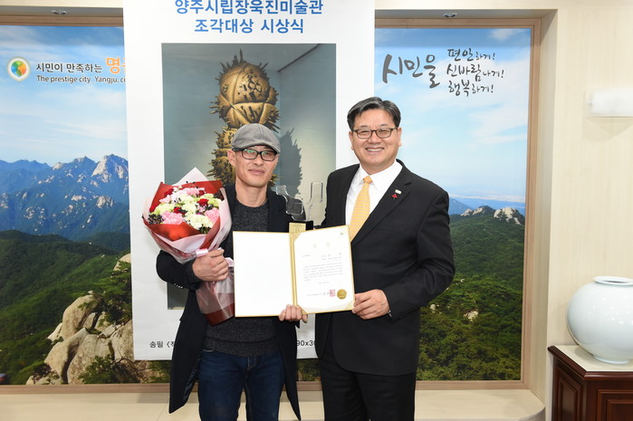 ▲송필 조각가(왼쪽)가 양주시립장욱진미술관 조각대상을 수상하고 있다. |