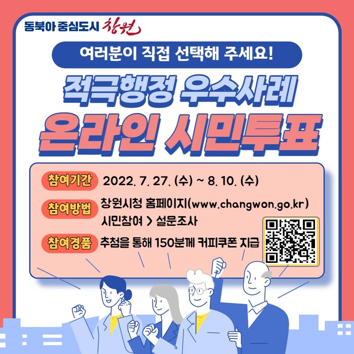 [로컬세계=한용대 기자]경남 창원특례시(시장 홍남표)는 27일부터 8월 10일까지 창원시 적극행정 우수사례를 선정하기 위해 시민 투표를 창원시 홈페이지에서 실시한다고 밝혔다.