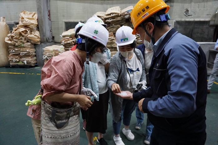 | ▲참가자들이 친환경 티셔츠 제작 공정을 확인하게 위해 공장 관계자와 이야기를 나누는 모습. |