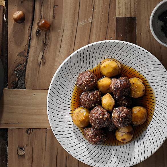 달짝지근한 밤은 육즙이 풍부하고 고소한 한우의 맛과 궁합이 좋은 식재료다. 대표적으로 둥글둥글한 모양에 하나씩 집어먹기 좋은 ‘한우볼 밤조림’은 아이들 간식으로도 제격이다. 한우 우둔살을 곱게 다져 밑간을 한 뒤 녹말가루를 약간 넣고 동그랗게 볼을 만들어 오븐에 익혀준다. 팬에 데리야키 소스, 다시마, 꿀, 생강, 설탕 등을 섞은 소스와 함께 데친 밤을 넣고 조리다가 익힌 한우 볼을 넣고 조금 더 조려내면 한우볼 밤조림이 완성된다.