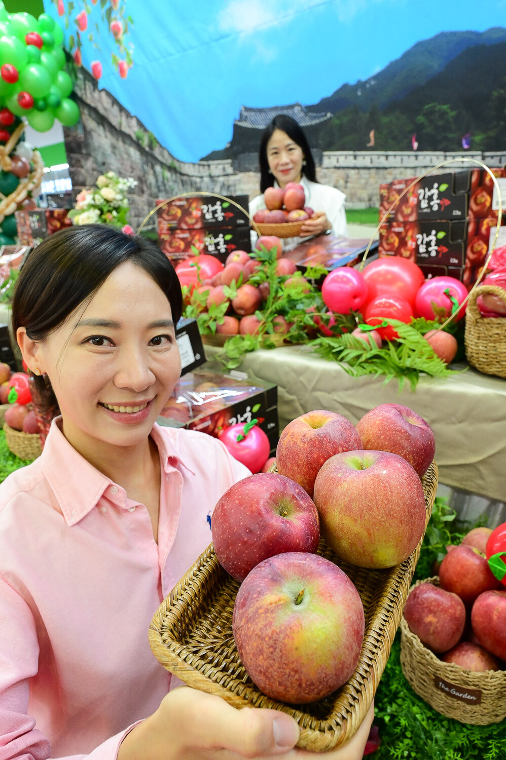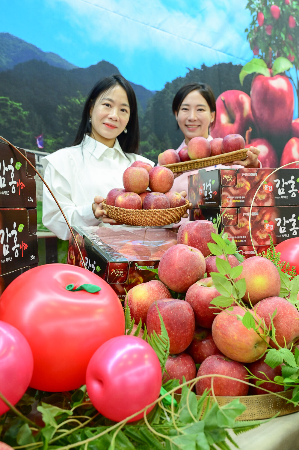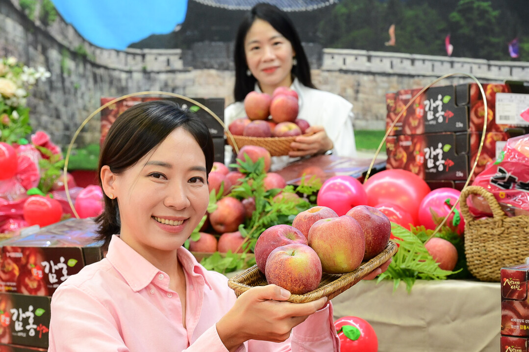 23일 서울 서초구 하나로마트 양재점에서 모델들이 올해 처음 판매하는 '감홍 사과'를 선보이고 있다. 농협유통 제공