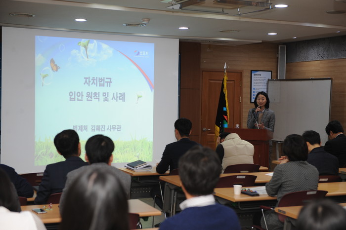 이번 교육은 법제처 자치법제지원과 김혜진 행정사무관을 통해 자치법규 입안 주체, 제·개정 범위와 한계, 입안 시 고려할 법령 등 차지법규 입안 개관과 자치법규 의견제시 사례 등에 대해 이뤄졌다.
