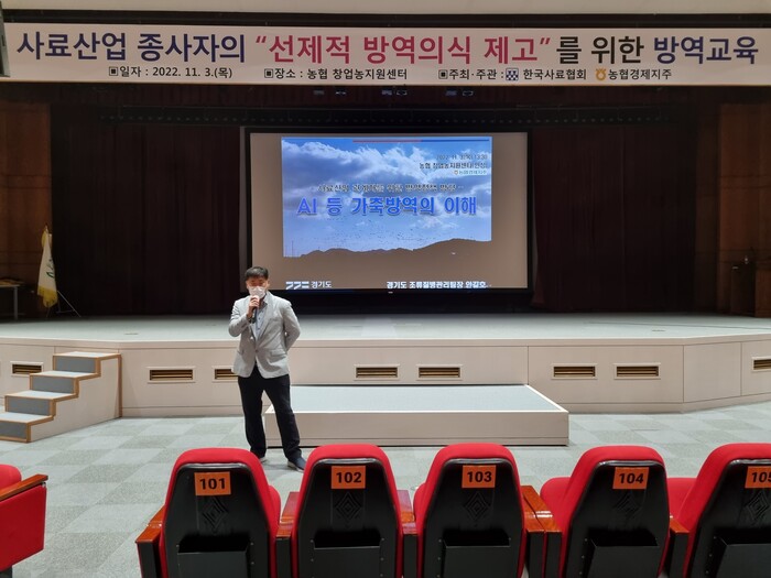 농협 축산경제(대표이사 안병우)는 3일 한국사료협회와 공동주관으로 안성에 위치한 농협 창업농지원센터에서 ‘국내 사료산업 종사자 방역교육’을 실시했다고 밝혔다.