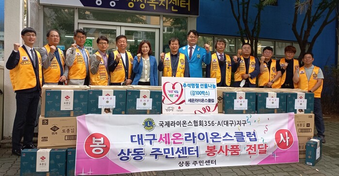 [로컬세계=박세환 기자] 국제라이온스협회356-A지구 대구 세온라이온스클럽(회장 김동원)은 지난 5일 추석을 맞아 어려운 이웃에게 전달해 달라며 김 100세트(150만원 상당)를 상동 행정복지센터에 기탁했다.