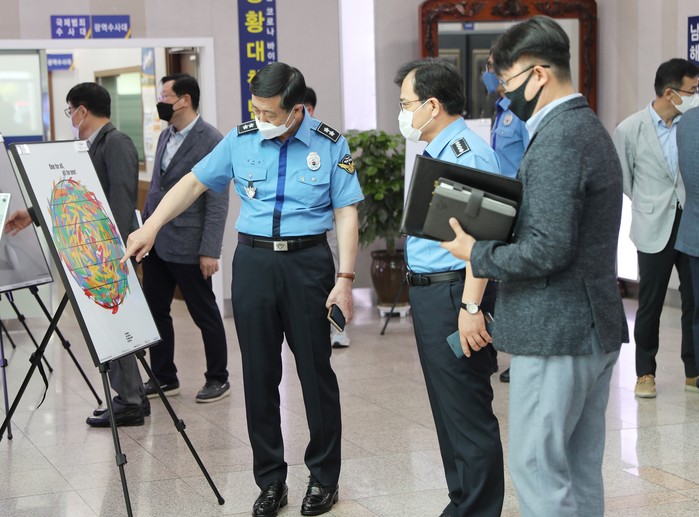 | ▲구자영 남해해양경찰청장과 직원들이 남해해경청 1층 로비에서 개최된 유엔 인권포스터전시회를 감상하고 있다. |
