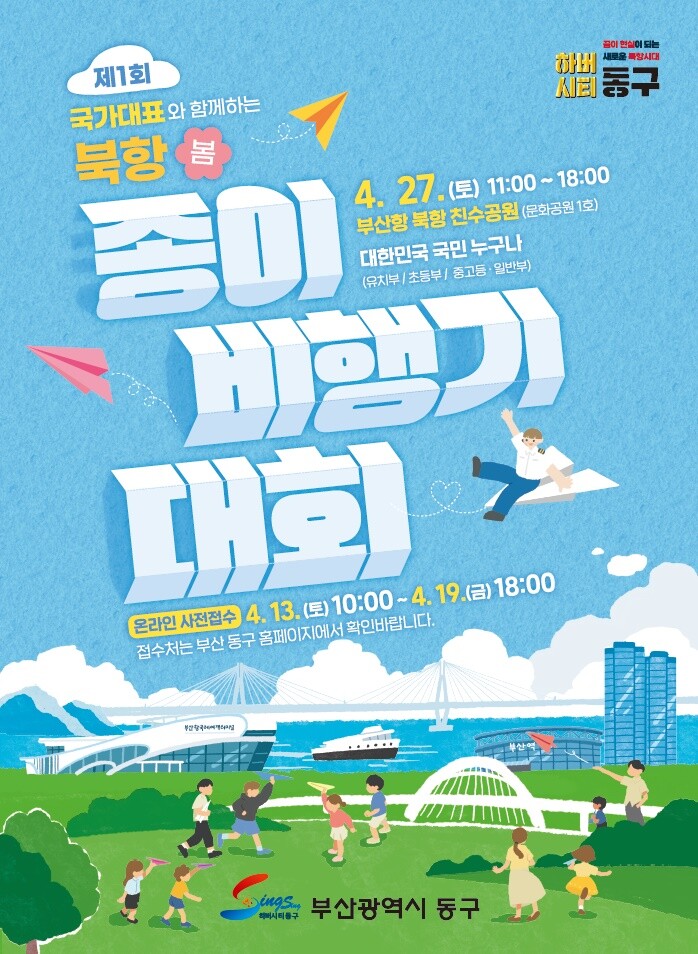 [로컬세계 부산=맹화찬 기자]부산 동구(구청장 김진홍)는 오는 27일 북항친수공원(문화공원1호)에서 색다른 봄축제 ‘북항 종이비행기 페스티벌'을 개최한다고 11일 밝혔다.