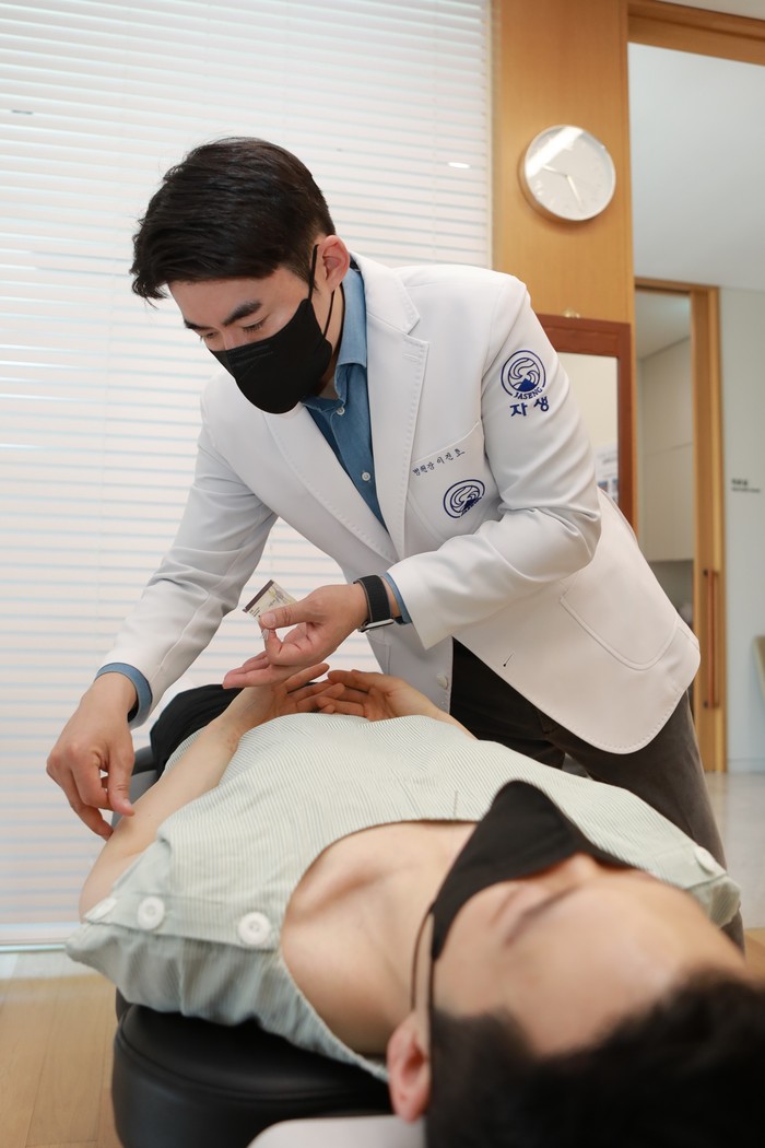 ▲자생한방병원 이진호 병원장이 코로나 회복 클리닉을 열고 환자를 치료하고 있다. |