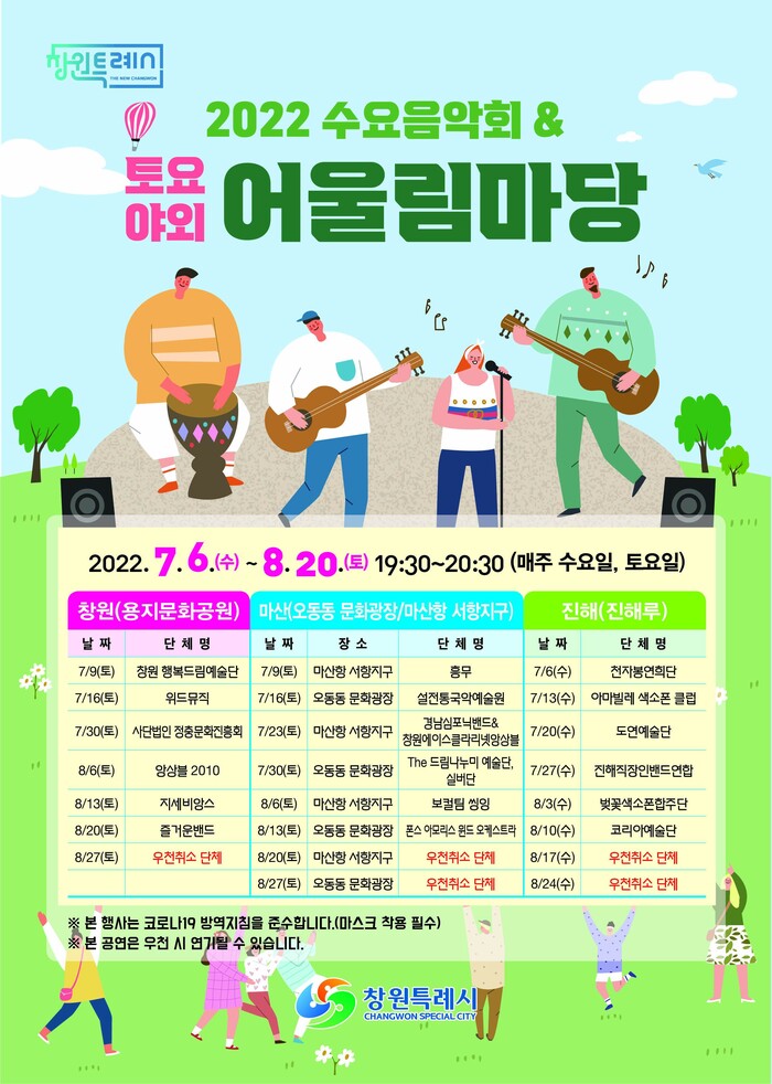 창원특례시가 주최, 주관하는 2022 수요 및 토요 야외 음악회는 7~8월 동안 창원지역 민간예술단체들의 다채롭고 정성스러운 무대들로 준비되어 있으며, 매주 수요일에는 진해루, 매주 토요일은 창원용지문화공원, 그리고 마산항 서항지구와 오동동문화광장에서는 격주 토요일마다 공연이 열릴 예정이다.