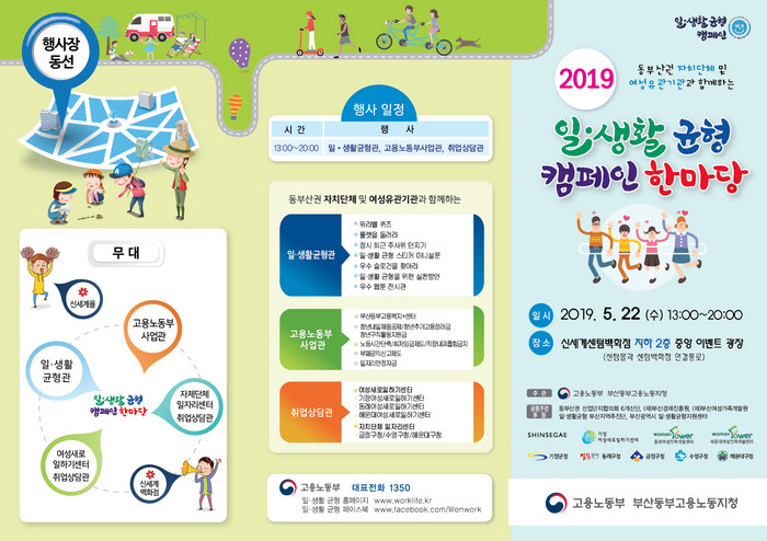 한편 ‘일·생활 균형 캠페인 한마당’ 행사에서는 고용노동부 사업관을 통해 ‘청년내일채움공제 등 청년3대 패키지사업‘과 ’노동시간단축’, ‘최저임금제도’, ‘직장내괴롭힘금지’ ‘부패공익신고제도’ 등도 함께 홍보할 예정이다.