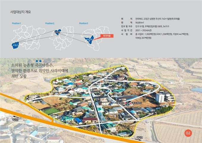 5일 고창군에 따르면 대통령 직속국가균형발전위원회(균형위)가 주관하고 농림축산식품부와 공동으로 추진하는 ‘취약지역 생활여건 개조사업’ 공모사업에 심원면 죽곡마을이 선정돼 국비 12억원을 포함 총사업비 19억원을 확보했다.