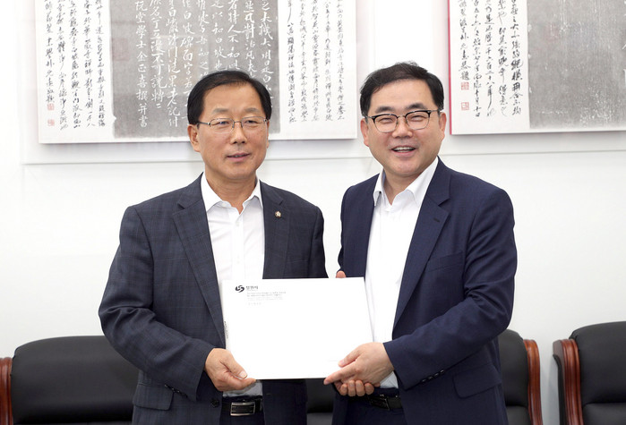 | ▲허성무 창원시장이 국회 예산결산특별위원회 윤후덕 간사에게 희망근로 추경예산과 2020년 국비확보를 위한 사업계획서를 전달하고 있다.(창원시 제공) |