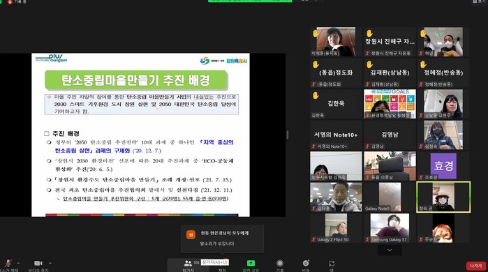 [로컬세계 한용대 기자]경남 창원시(시장 허성무)는 11일 오후 2시 온라인으로 55개 전 읍면동 탄소중립마을만들기 추진위원회 위원을 비롯한 관계공무원 등 200여 명이 참석한 가운데 ‘2022년 탄소중립마을만들기 사업설명회’를 개최했다.