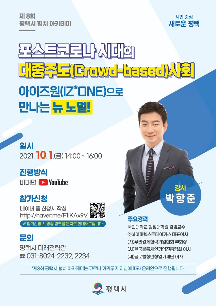 이번 강연은 국민대학교 행정대학원 박항준 교수가 강사로 나서 코로나19 바이러스의 감염병 세계적 유행(팬데믹) 극복 이후인 포스트 코로나시대에 대중들이 정치, 경제, 사회 등에 있어 어떤 식으로 참여하고 주도해 나가는지 설명해줄 예정이다.