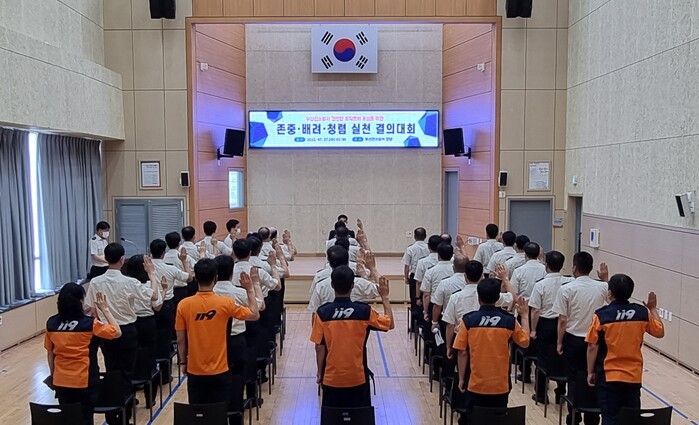 [로컬세계 부산=맹화찬 기자]부산 부산진소방서는 27일 본서 강당에서 직원 대상으로 존중·배려·청렴 실천 결의 대회 및 교육을 실시했다고 밝혔다.