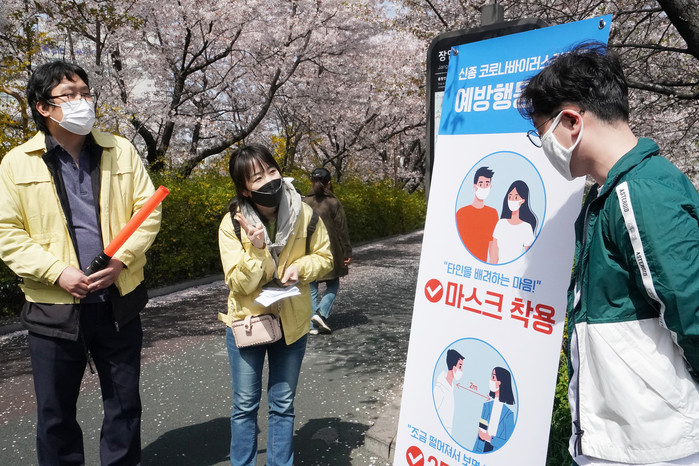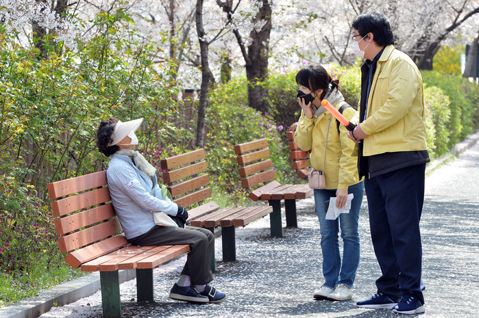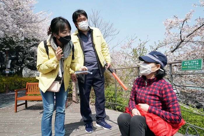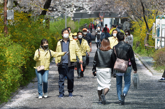 ▲4일, 동대문구청 직원들이 장안벚꽃안길에서 산책에 나선 주민들에게 ‘사회적 거리두기’를 안내하고 있다.(동대문구 제공) |