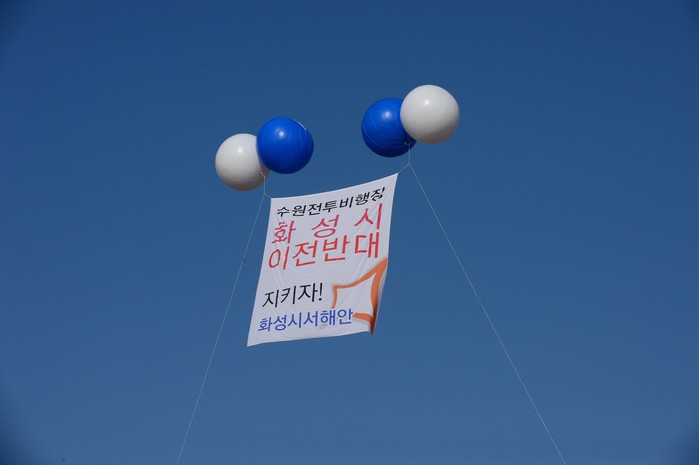 하늘에는 ‘수원 전투비행장 화성시 이전반대’문구가 새겨진 대형 애드벌룬이 띄워졌다. 급수대마다 화성호에서 서식하는 천연기념물과 멸종위기 조류들의 삽화 배너도 세워졌다.