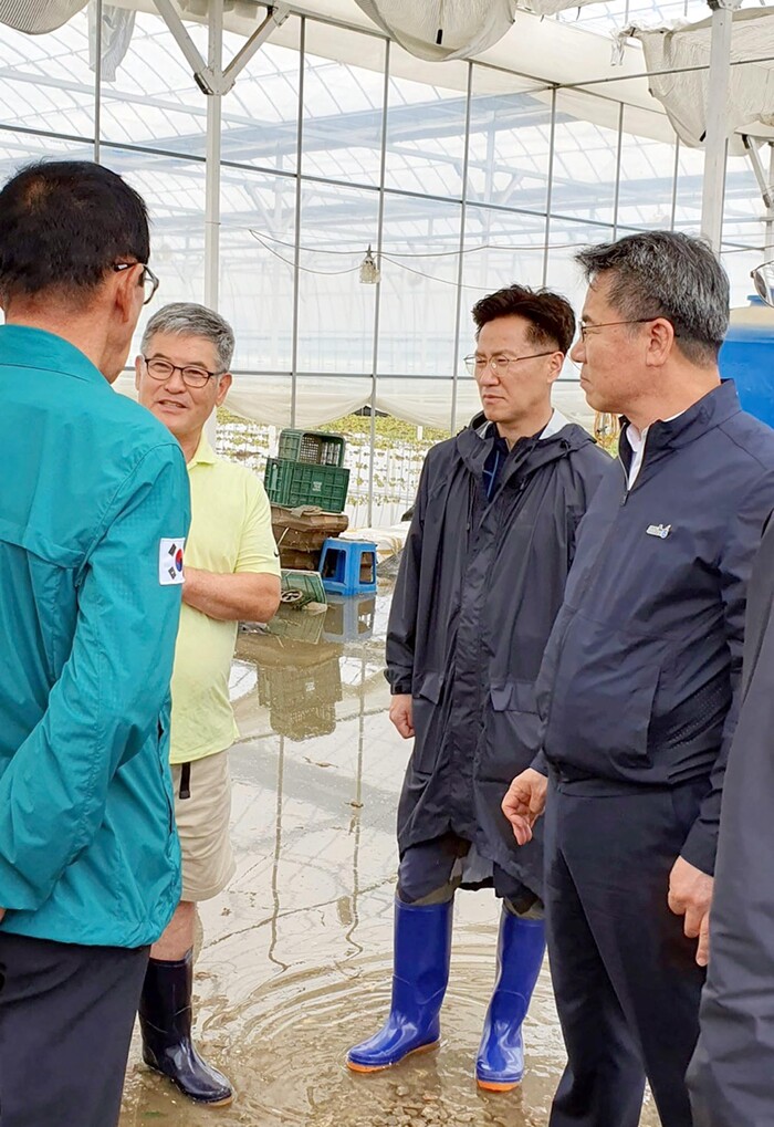 이날 박서홍 대표이사는 김원철 부안농협 조합장, 박명남 망성농협 조합장과 함께 전북 익산시 관내 수해 농가를 방문하여 비닐하우스 시설 피해 현황을 점검하고 농업인 애로사항을 청취하였다.