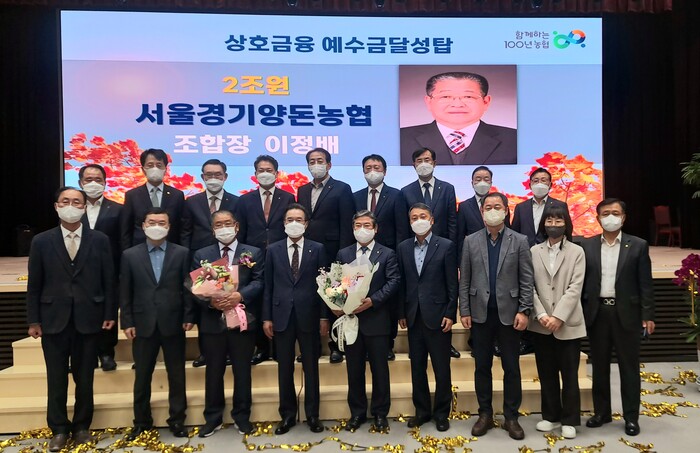 농협(회장 이성희)은 8일 11월 정례조회에서 서울경기양돈농협(조합장 이정배)에 상호금융예수금 2조원 달성탑을 시상했다.
