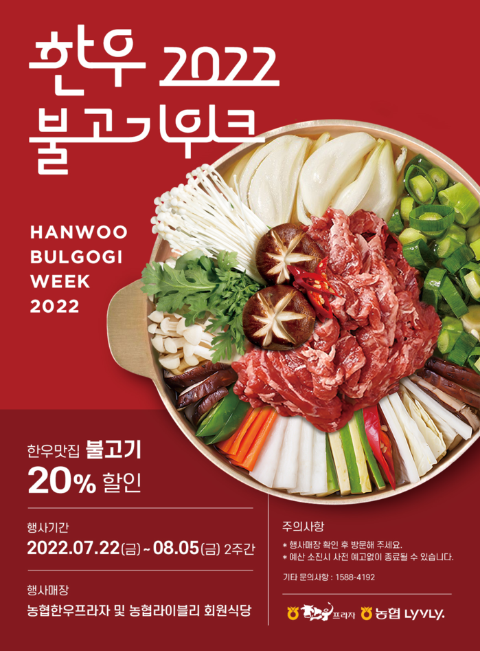 농협(회장 이성희)경제지주 축산경제는 불고기 메뉴를 활용한 한우의 맛과 우수성을 널리 알리기 위해 전국 농·축협 한우프라자와 축산물 전문 온라인 쇼핑몰 농협 라이블리 및 라이블리 회원식당에서 ‘한우 2022 불고기위크’ 행사를 8월 5일까지 진행한다고 22일 밝혔다.