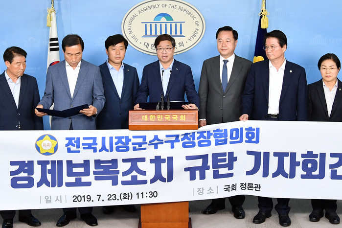 전국시장·군수·구청장협의회(대표회장 염태영 경기 수원시장)는 23일 오전 11시30분에 국회 정론관에서 기자회견을 개최하여, 최근 일본 아베 정부의 일방적.보복적 수출규제에 대해 조속한 철회를 촉구하고, 협의회 주도 하에 ‘일본제품 불매운동’ 전개와 더불어 공무수행을 위한 일본방문을 중단하겠다고 밝혔다.