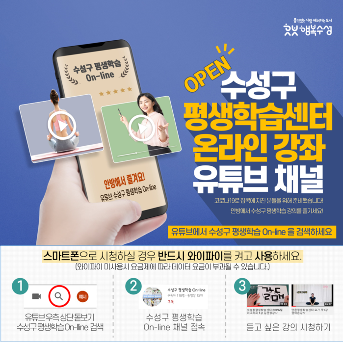 수성구 평생학습 On-line은 코로나19로 각종 현장강의, 교육 등이 중단되거나 축소됨에 따라 배움에 대한 갈증을 느끼는 주민들에게 지속적인 평생학습 기회를 제공하고자 마련됐다.