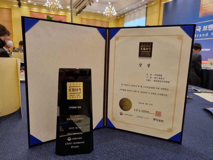 | ▲2022 대한민국 브랜드 명예의 전당'지역화폐 부문 선정. 화성시 제공 |