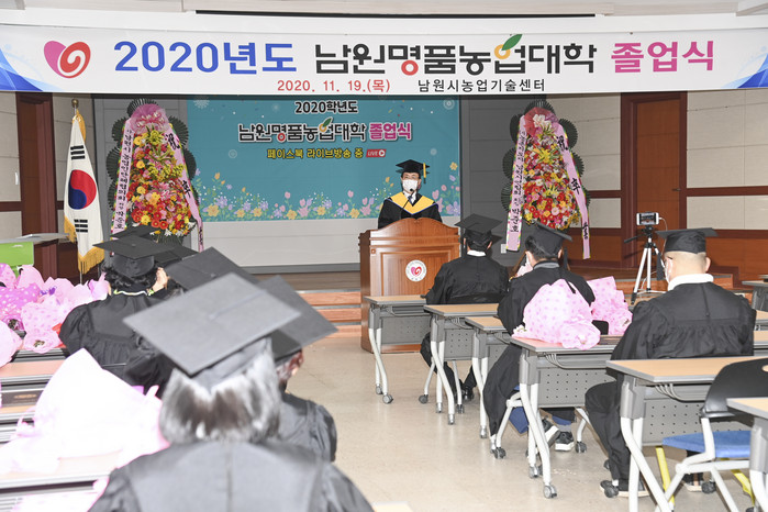 [로컬세계 이태술 기자]전북 남원시농업기술센터는 지역농업을 선도할 전문농업인육성을 목표로 명품농업대학과정을 운영해 19일 온· 오프라인 동시 졸업식을 가졌다.
