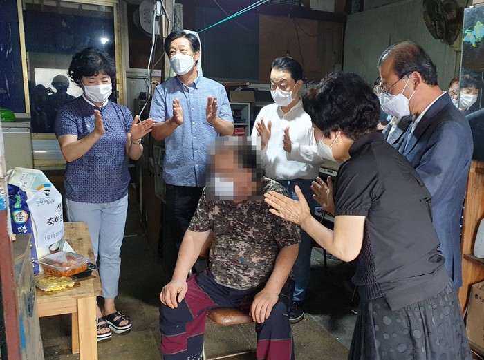 | ▲수성4가동 희망나눔위원회외 동 행정복지센터 직원들이 저소득 1인가구를 방문해 축하선물을 전달하고 생일을 축하하고 있다. |