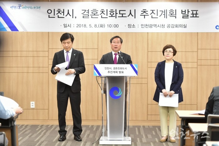 유 시장은 8일 인천시청에서 행정부시장, 여성가족국장을 대동하고 기자회견을 열어 ‘결혼하기 좋은 도시 인천’을 만들기에 시동을 걸겠다며 결혼 인식을 개선하고 신혼부부의 주택 전월세 이자를 지원한다고 밝혔다.