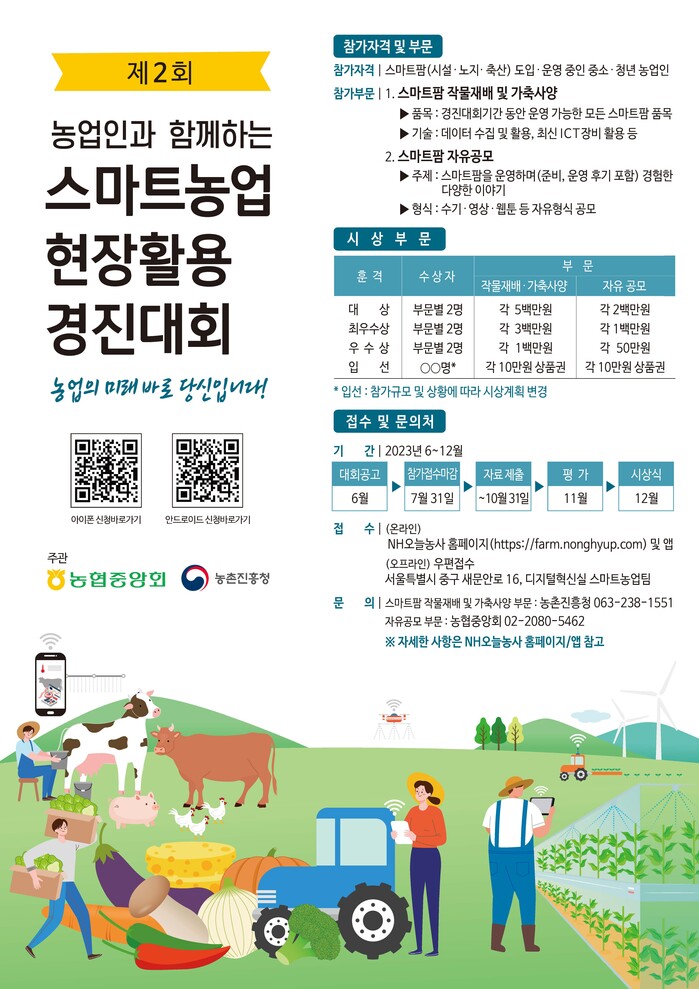 이번 경진대회는 농협중앙회와 농촌진흥청이 체결한 MOU를 계기로 지난해 1회 대회에 이어 공동 개최되며, 참가부문은 ▲스마트팜작물재배 및 가축사양 ▲스마트팜 자유 공모 2가지이다.