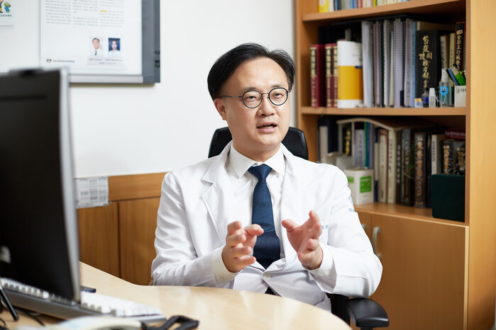 ▲강동경희대학교병원 한방내과 윤성우 교수가 암 관련 증상을 치료하고 관리하는 지지완화요법의 종류와 효과에 대해 설명하고 있다. |