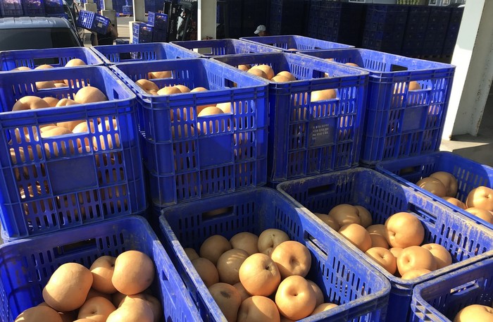 ▲25일, 전남 나주의 농산물산지유통시설(APC)에서 가공용 배 수매작업을 본격적으로 실시하고 있다. |