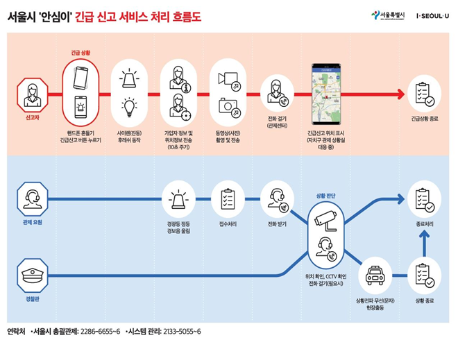 자치구별로 운영 중인 통합관제센터가 컨트롤타워가 돼 서울 전역에 설치된 약 4만 대 CCTV와 스마트폰 앱을 연계해 위험상황을 실시간 모니터링하고 구조 지원으로 이어진다.
