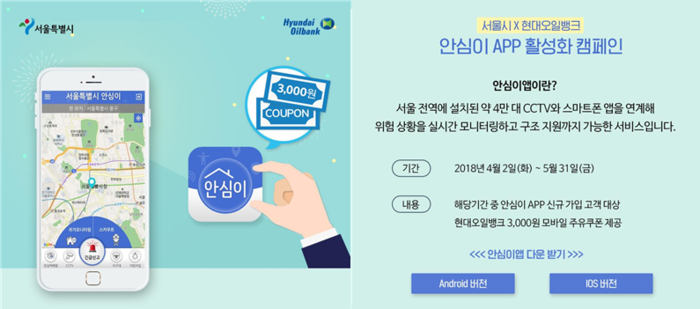 오는 2일부터 내달 31일까지 호신용 앱 ‘안심이’를 신규 등록만 해도 현대오일뱅크 주유쿠폰 3000원 권이 3만명에게 제공된다. 이는 회원가입 후 캠페인 참여에 동의하는 이용자에 한해서며 7일 이내 휴대폰 문자로 주유할인권이 발송될 예정이다.