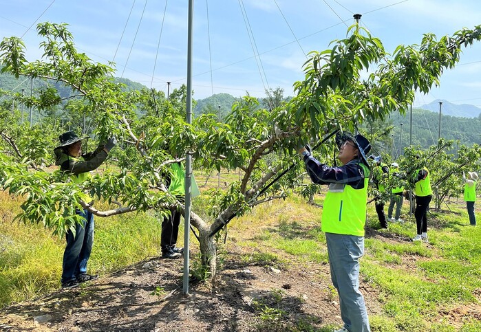 이어 산지유통부는 지난 10일 충북 보은 복숭아 재배 농가를 찾아 복숭아 적과작업을 도우며 봉사활동에 동참했다. 염기동 농협경제지주 산지도매본부장과 산지유통부 직원 20여 명은 안정적인 착과관리를 위해 결실상태가 미숙한 복숭아를 솎아낸 뒤 마을 환경미화 등 현장지원활동을 펼쳤다.