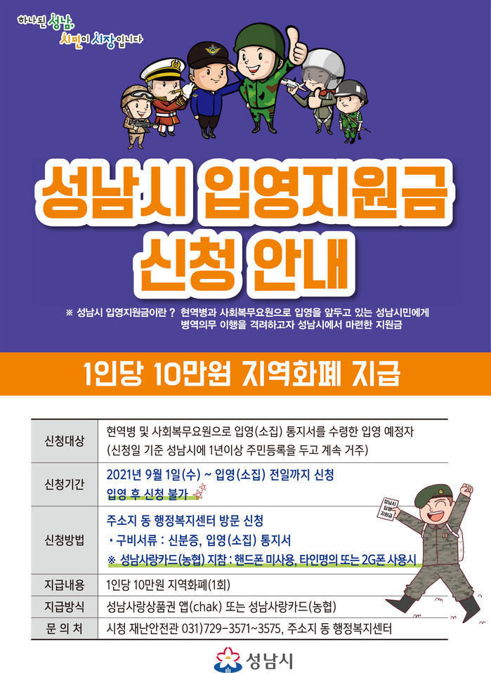 [로컬세계 김병민 기자]경기 성남시(시장 은수미)는 현역병이나 사회복무요원으로 입영하는 시민에 10만원의 입영지원금을 지급한다고 17일 밝혔다.