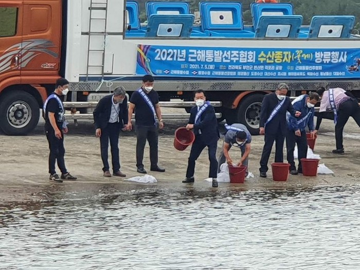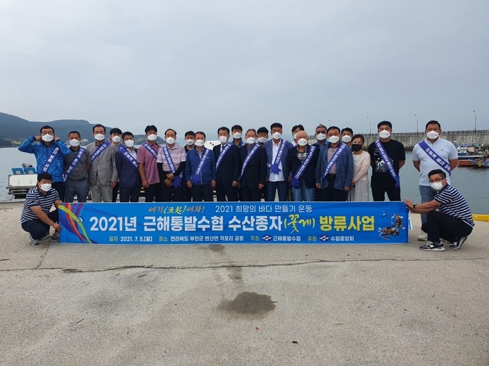 [로컬세계 김경락 기자]근해통발협회(회장 김용근)와 근해통발수협에서는 ' “어기(漁起)여차” 2021 희망의 바다만들기'라는 슬로건으로 5일 전북 부안군 앞바다에 협회와 수협에서 확보한 방류예산 7000만원으로 꽃게치어 39만미를 방류했다.