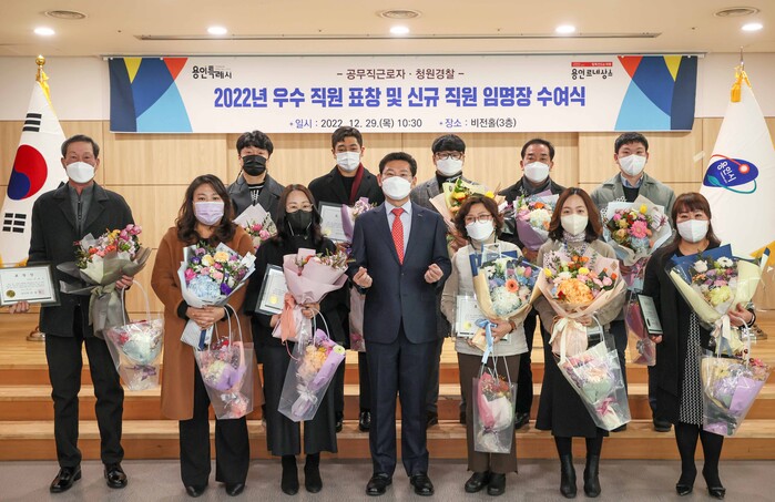 ▲ 이상일 용인특례시장이 표창을 수상한 직원들과 기념 촬영을 하고 있다. 용인특례시 제공 |