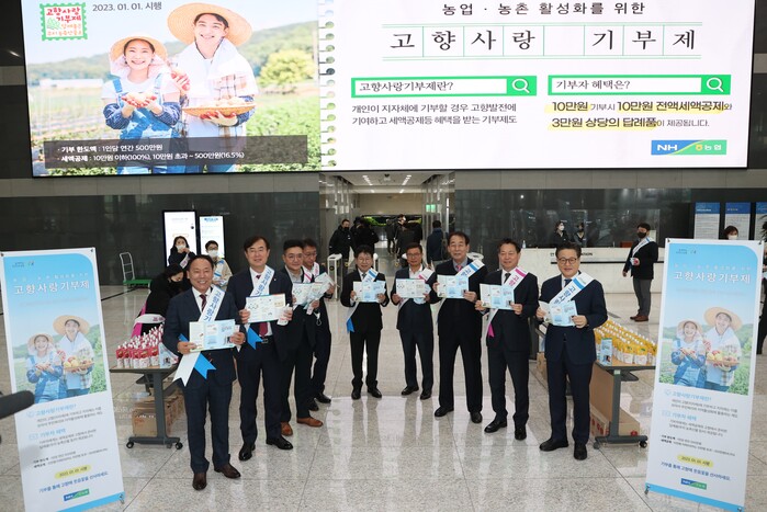 농협중앙회(회장 이성희)는 2023년 1월 1일 시행된 고향사랑기부제의 활성화 붐 조성 및 성공적 안착을 위해 오늘 4일 서울 중구 농협중앙회 및 농협은행 본관에서 ‘고향사랑기부제 농협 임직원 홍보 캠페인’을 실시했다.