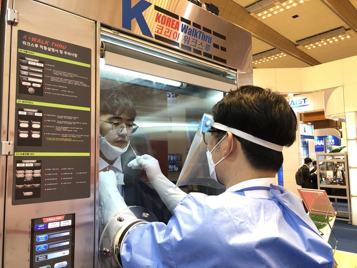 이번에 전시된 ‘워크스루’는 의료진이 부스에 장착된 터치스크린을 가동하면 소독액이 적셔 있는 롤러가 회전하며 부스 전체를 꼼꼼히 소독하는 자동소독기능이 탑재된 3.5 버전의 진료 부스로 보다 안전한 검사 환경을 구현했다. 또한 교차감염을 차단하기 위해 환자 구역내 상주 의료진 없이 무인 운영되며 부스 도어도 자동 개폐 방식으로 개선했다.