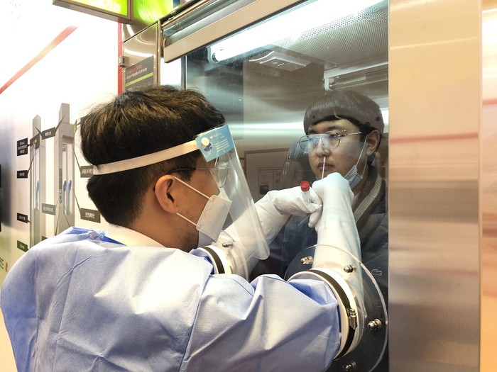 ▲18일 코엑스에서 열린 KIMES2021 에이치플러스 양지병원 ‘워크스루’ 진료부스에서 ‘코로나19’ 검사 시연을 하고 있다. <사진 제공=H+양지병원> |