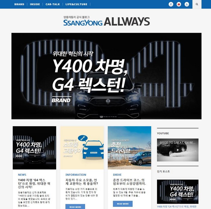 또한 2017 서울모터쇼를 통해 공개된 신차 G4 렉스턴 출시를 앞두고 개발자 인터뷰, 충돌 및 주행 테스트, 궁금증 해결 코너 등 다양한 콘텐츠를 통해 고객과 소통할 예정이다.
