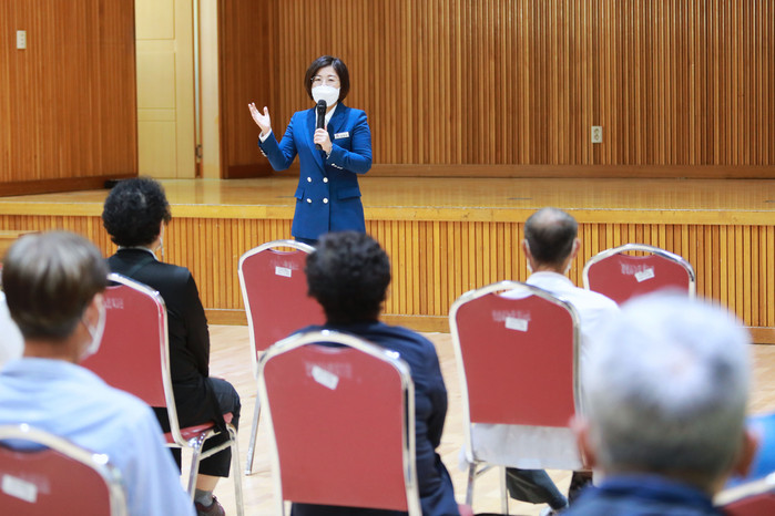| ▲김보라 시장이 지난 24일 안성시노인복지관에서 수행하는 '노노케어' 노인일자리 직무교육 현장을 방문해 참여 어르신들을 격려하고 있다. 안성시 제공 |
