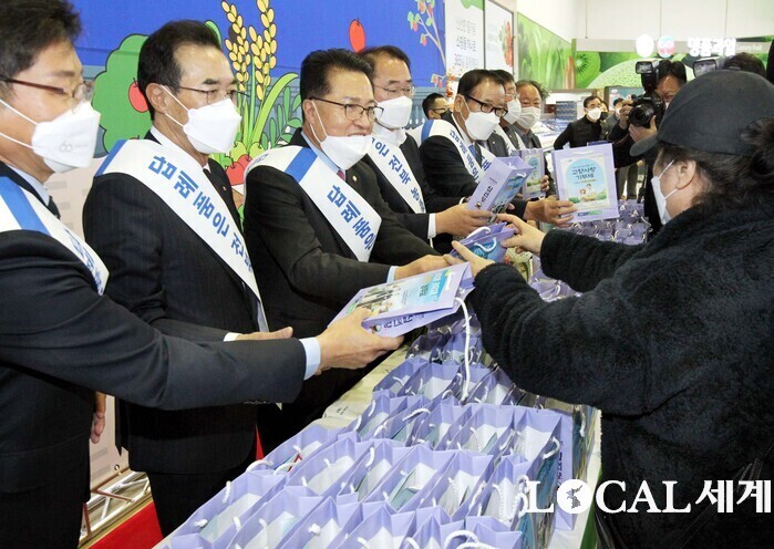 | ▲ 농협은 17일 하나로마트 양재점에서 내년 1월 시행되는 고향사랑기부제의 성공적인 정착을 위해 전라북도와 함께 ‘전북 고향사랑 농축산물 판매 홍보대전’을 진행했다. 이성희 농협중앙회장(왼쪽에서 두 번째부터), 정운천 국회의원 등 참석자들이 고객들을 대상으로 농협 가공제품 5종세트를 배부하며 홍보에 적극 나섰다. |