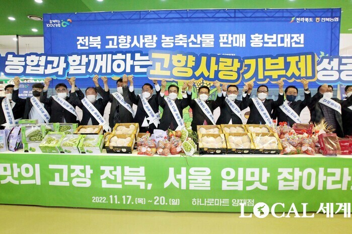 농협(회장 이성희)은 내년 1월 시행되는 고향사랑기부제의 성공적인 정착을 위해 전라북도(도지사 김관영)와 함께 우수 농축산물을 홍보하고자 17일부터 20일까지 농협하나로마트 양재점에서 '전북 고향사랑 농축산물 판매 홍보대전'을 진행한다.