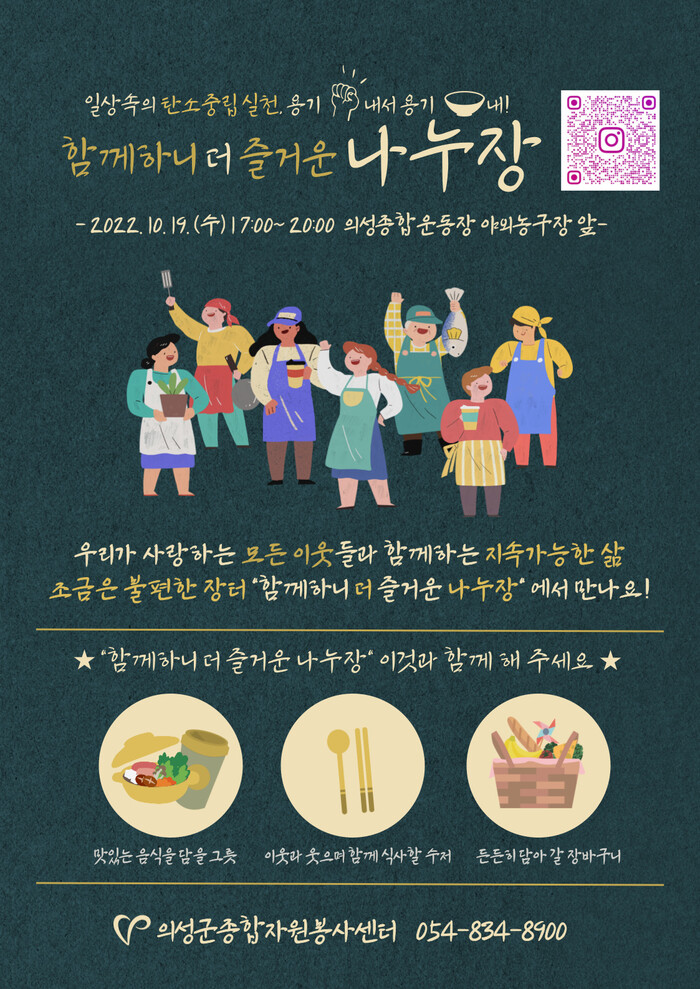 [로컬세계=박상진 기자]경북 의성군은 의성군종합자원봉사센터 주최로 지구를 지키는 한가지 실천, ‘함께하니 더 즐거운 나누장’이라는 주제의 주민참여 행사를 오는 19일 17시부터 20시까지 의성종합운동장 주차장에서 가진다.
