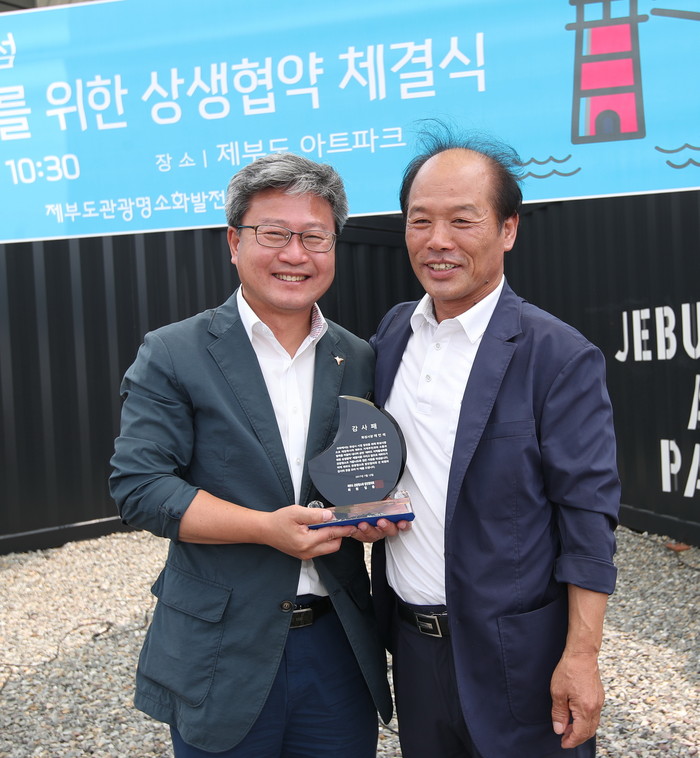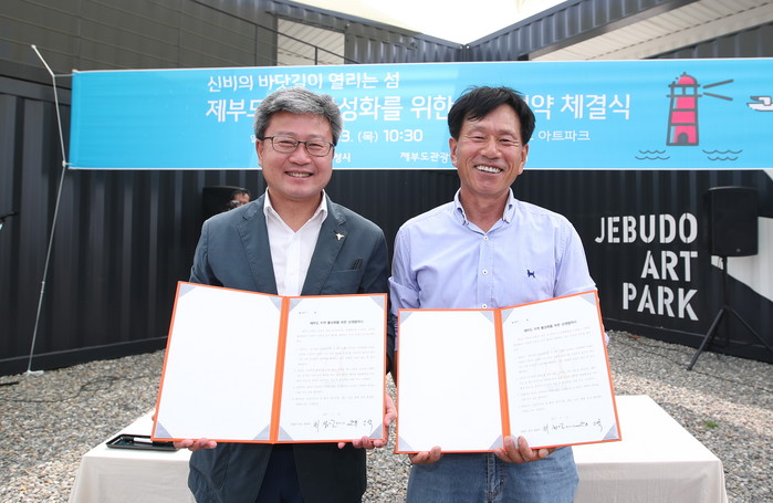 | ▲제부도 지역활성화를 위한 상생협약.(왼쪽 채인석 화성시장, 오른쪽 최석만 제부도관광명소화 발전협의회 회장) |