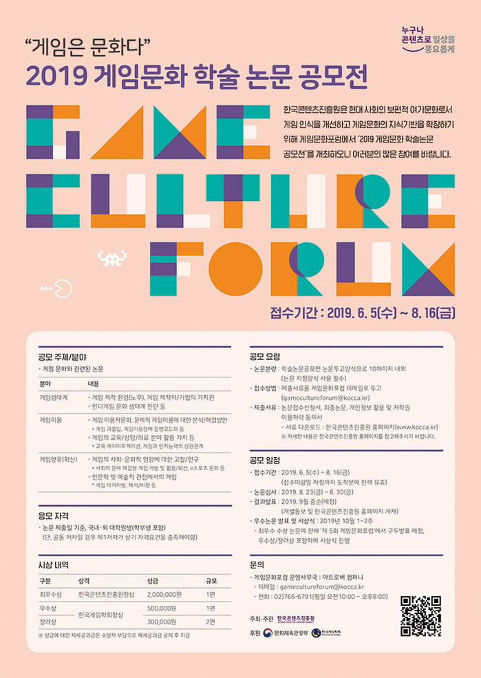 한국콘텐츠진흥원은 ‘2019 게임문화 학술논문공모전’을 열면서 8월 16일까지 국내·외 대학원생과 학부생을 대상으로 게임문화에 대한 주제에 대해 논문을 모집한다고 10일 밝혔다.