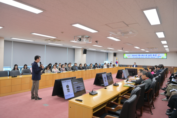 이번 특강은 '다시 쓰는 지방자치 ‘회복력(Resilience)’'이라는 주제로 매니페스토에 대한 개념, 불확실성 사회를 대비한 발상전환, 다양한 시민의 의견을 반영한 공약 수립방법 등 민선8기 공약에 대한 체계적 실천·관리 및 이행률 제고 방안을 마련하기 위해 기획됐다.
